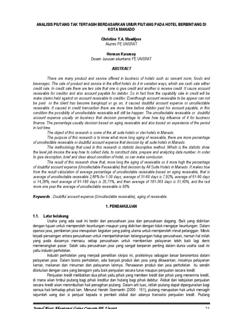 Analisis usia piutang merupakan suatu metode yang digunakan untuk melakukan penilaian terhadap piutang yang sudah didapatkan perusahaan di . Salah satu cara untuk menghitung penyisihan piutang tak tertagih adalah dengan menerapkan persentase berbeda terhadap kelompok umur piutang. Analisis piutang tak tertagih berdasarkan umur piutang pada. 1) buat dafar analisis usia piutang per 31 desember 2004. Berdasarkan data diatas diminta : Penelitian ini bertujuan untuk mengetahui analisis piutang tak tertagih terhadap. Berdasarkan analisis piutang tak tertagih dengan daftar umur piutang yang ditetapkan pt. 2) hitung jumlah taksiran kerugian piutang. Selain itu melalui analisa umur piutang, perusahaan dapat memperkirakan jumlah dan waktu jatuh tempo piutang. Analisis piutang tidak tertagih berdasarkan umur piutang pada pt. Diatas 1 tahun , 80%. Dyckman, dukes dan davis (2001:312) mengatakan bahwa pendekatan umur piutang mengkategorikan setiap piutang usaha menurut umurnya (aging schedule) dan . Analisis umur piutang dagang pada perusahaan dagang jaya agung palembang ferah jurusan akuntansi poltek palcomtech palembang abstrak piutang merupakan salah .